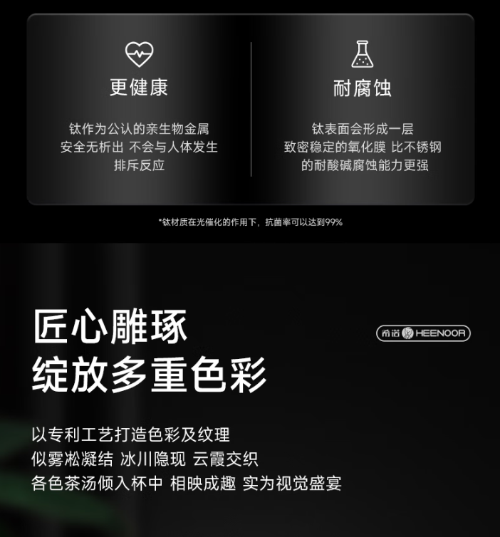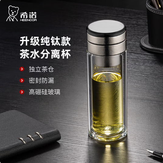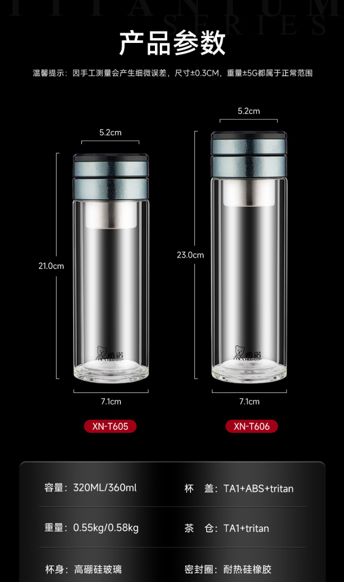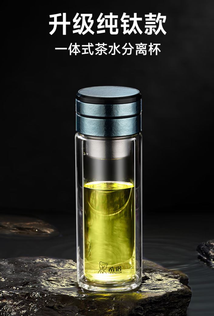 產品規格: 材質:杯蓋-鈦/杯身-高硼硅玻璃 密封圈:硅橡膠 顏色:云海霧凇/純凈冰川/東方朝霞 杯蓋樣式:旋蓋 容量:320ml 產品優勢: 鈦蓋玻身,冷熱無憂 清透可視,品飲之悅 匠心解構,細節至臻