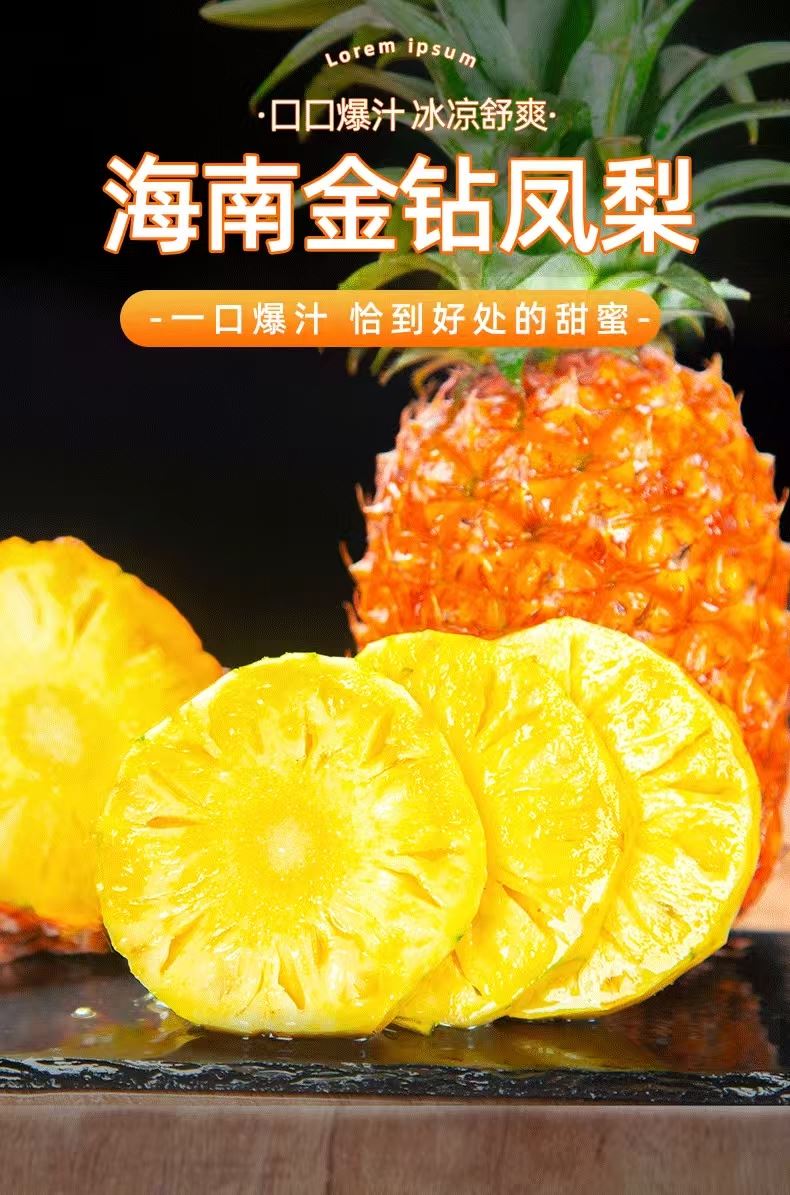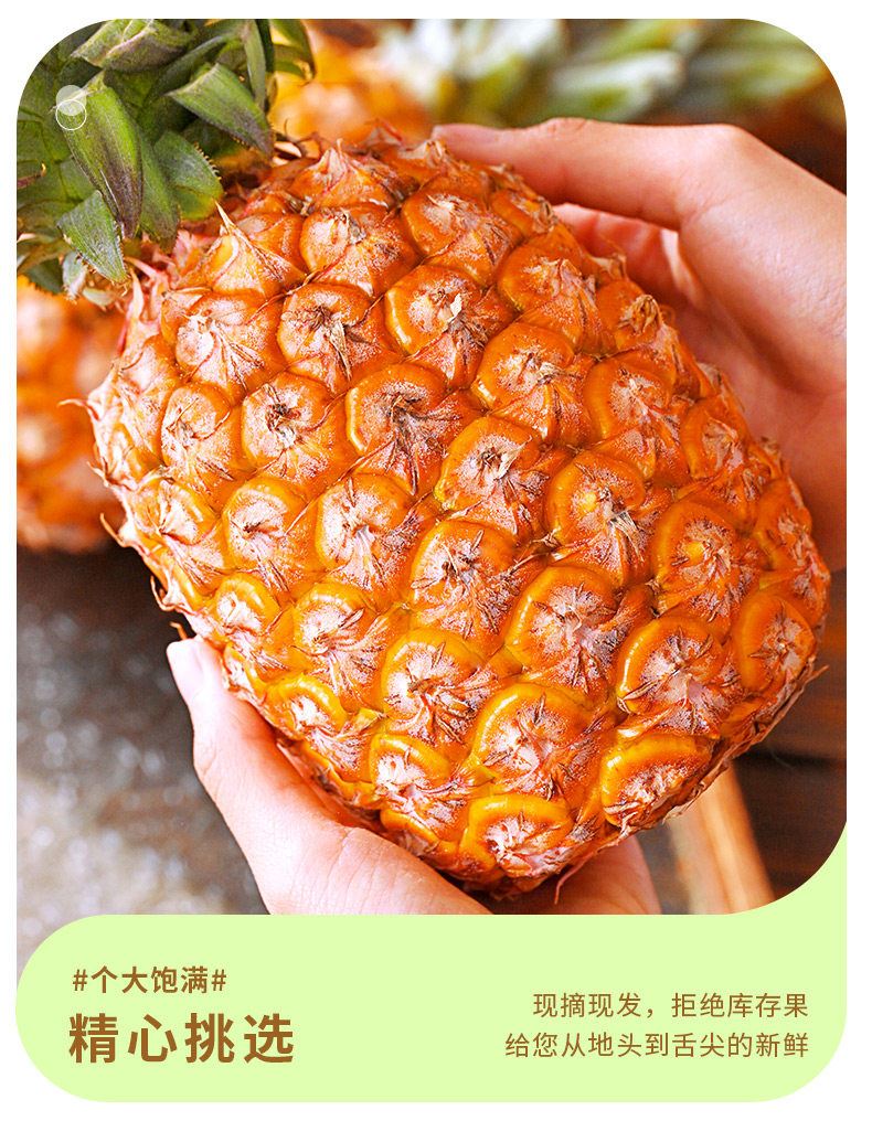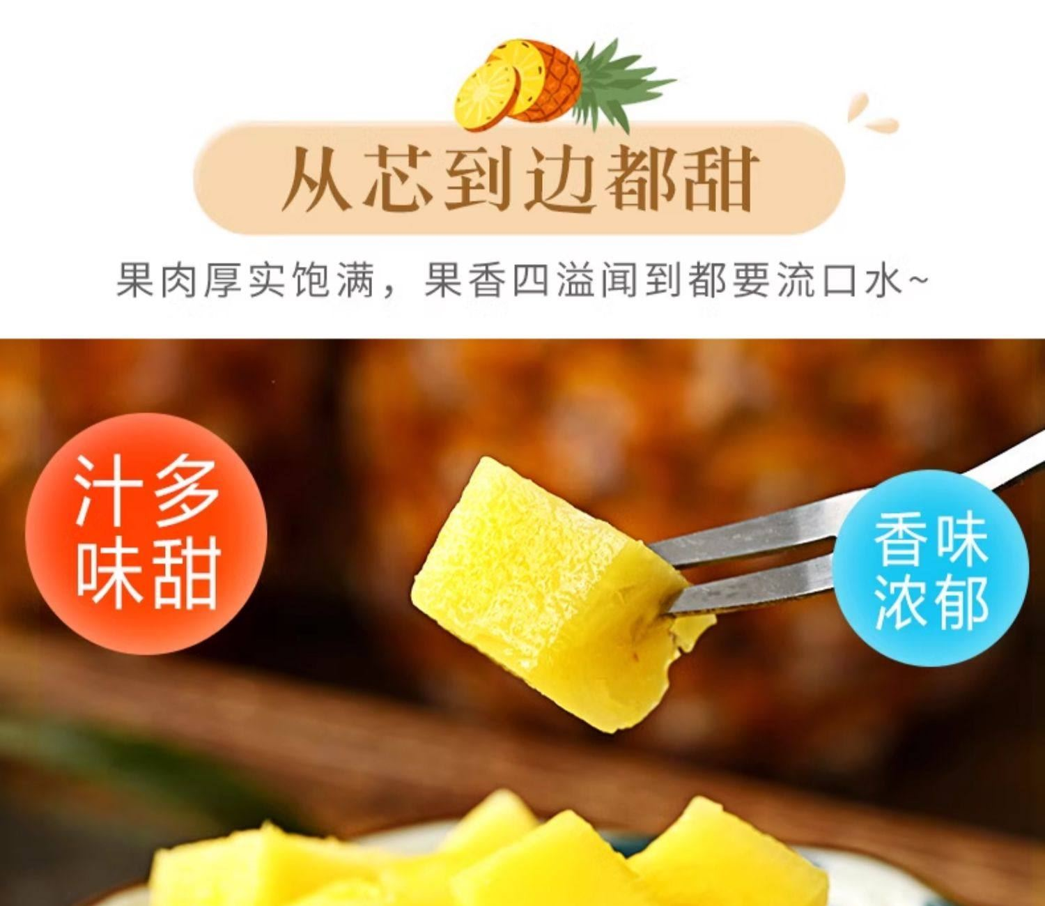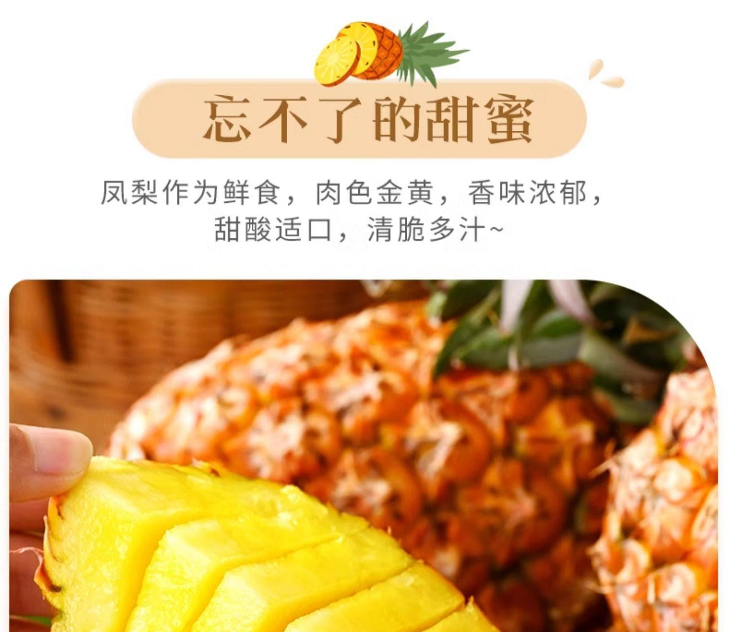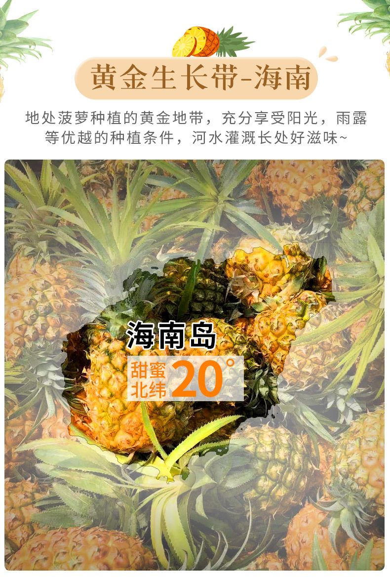 產地:海南 規格:5? 上市時間:9?中下旬 特點:免泡鹽?、芯軟可?、甜度??不膩 營養:富含菠蘿蛋?酶與維?素C,煥活肌膚 儲存:常溫