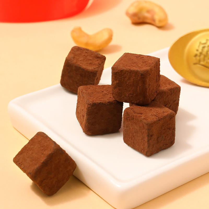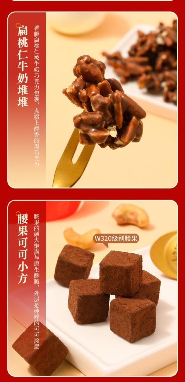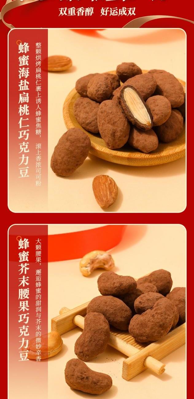 1、純烘烤扁桃仁裹上誘人的蜂蜜焦糖,再滾上香濃可可粉,雙層巧克力工藝,雙重香醇體驗扁桃仁裹牛奶巧克力+黑巧克力,風味大膽,咸甜交織,濃郁咸香,風味層次遠超普通巧克力。