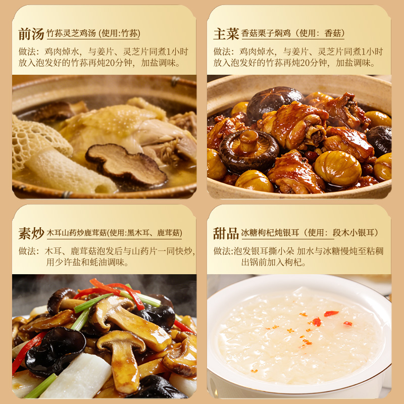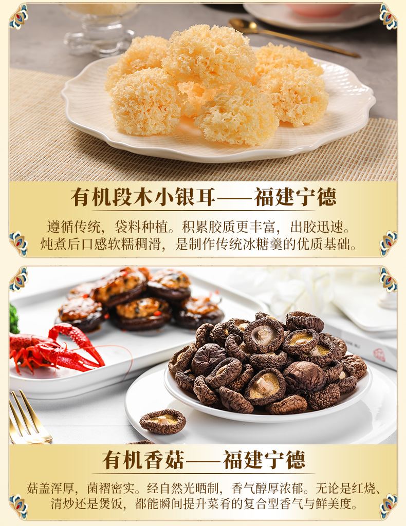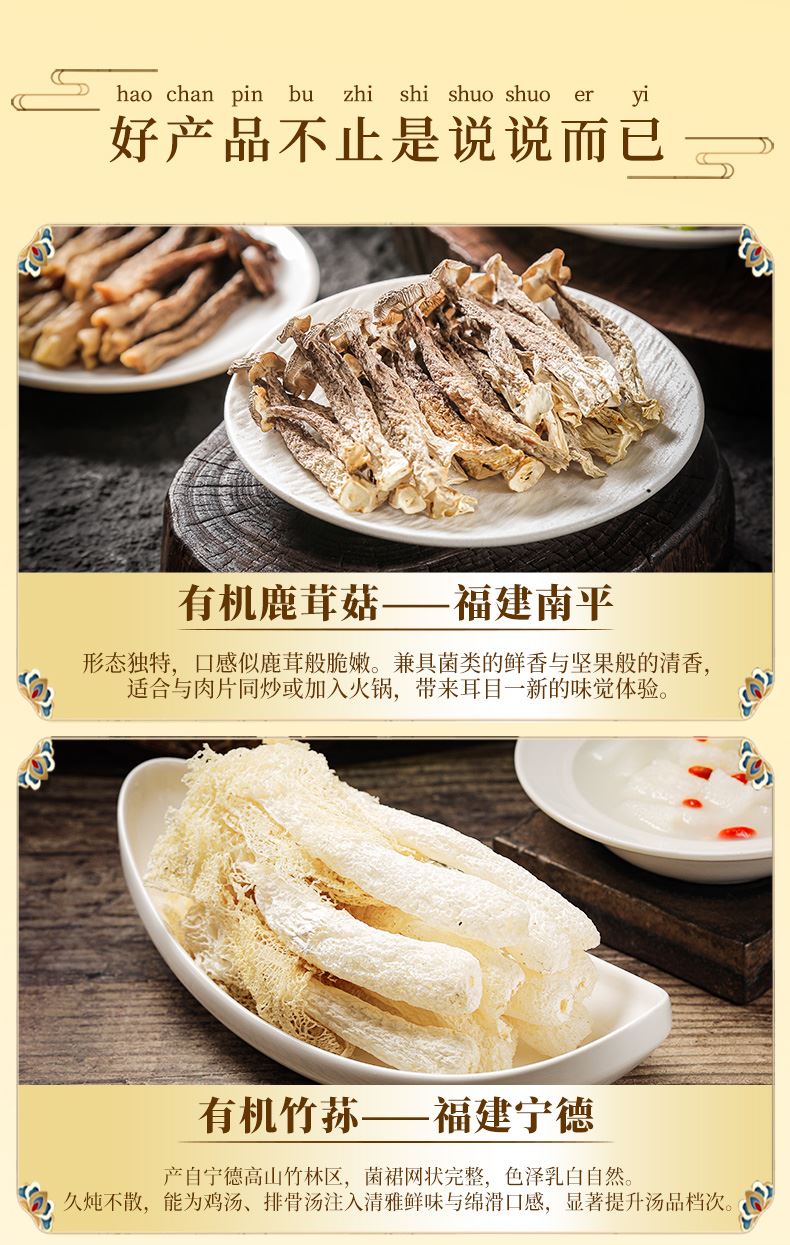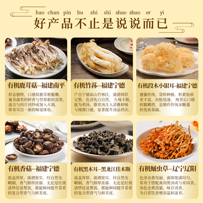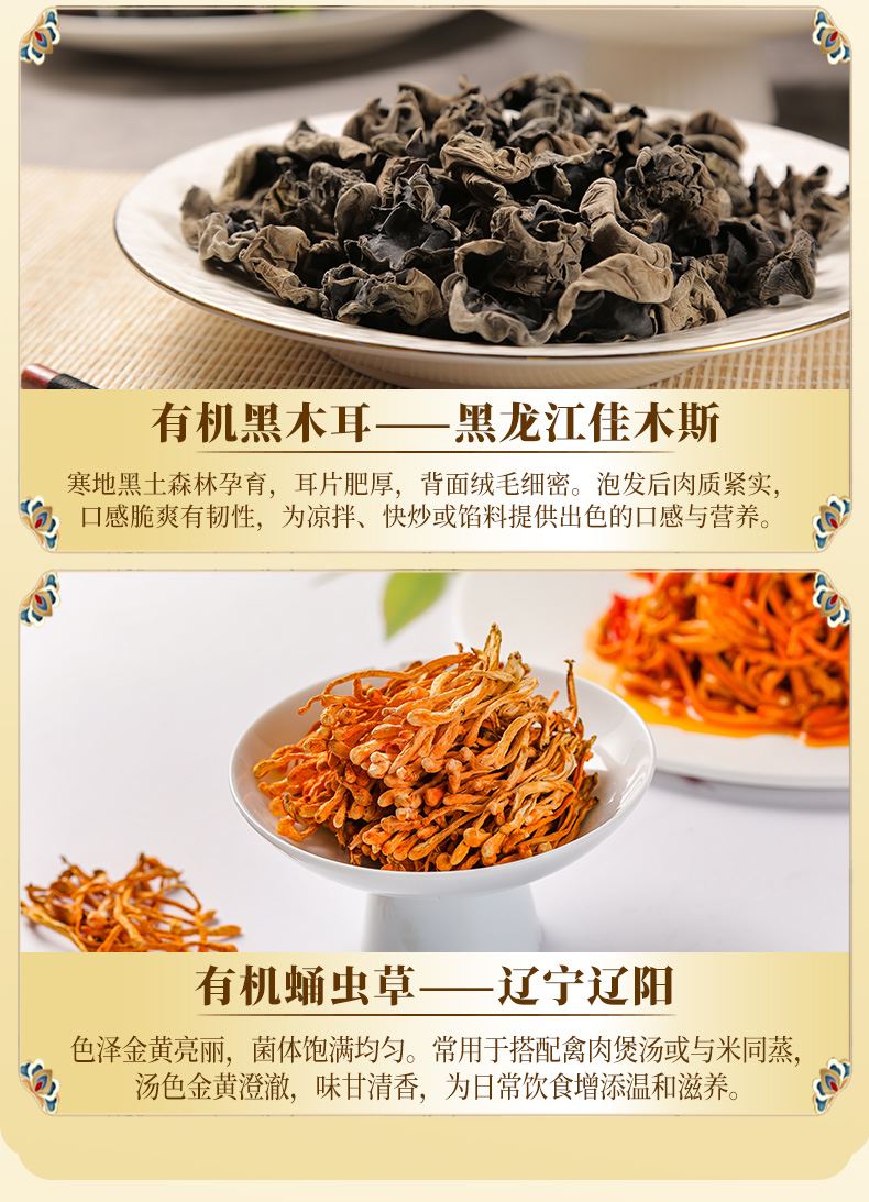 精選有機竹蓀25g 福建古田 精選有機椴木小銀耳125g 福建古田 精選有機香菇 165g 福建古田 精選有機黑木耳 160g 黑龍江佳木斯 精選有機鹿茸菇150g 福建南平 精選有機蛹蟲草90g 遼寧遼陽