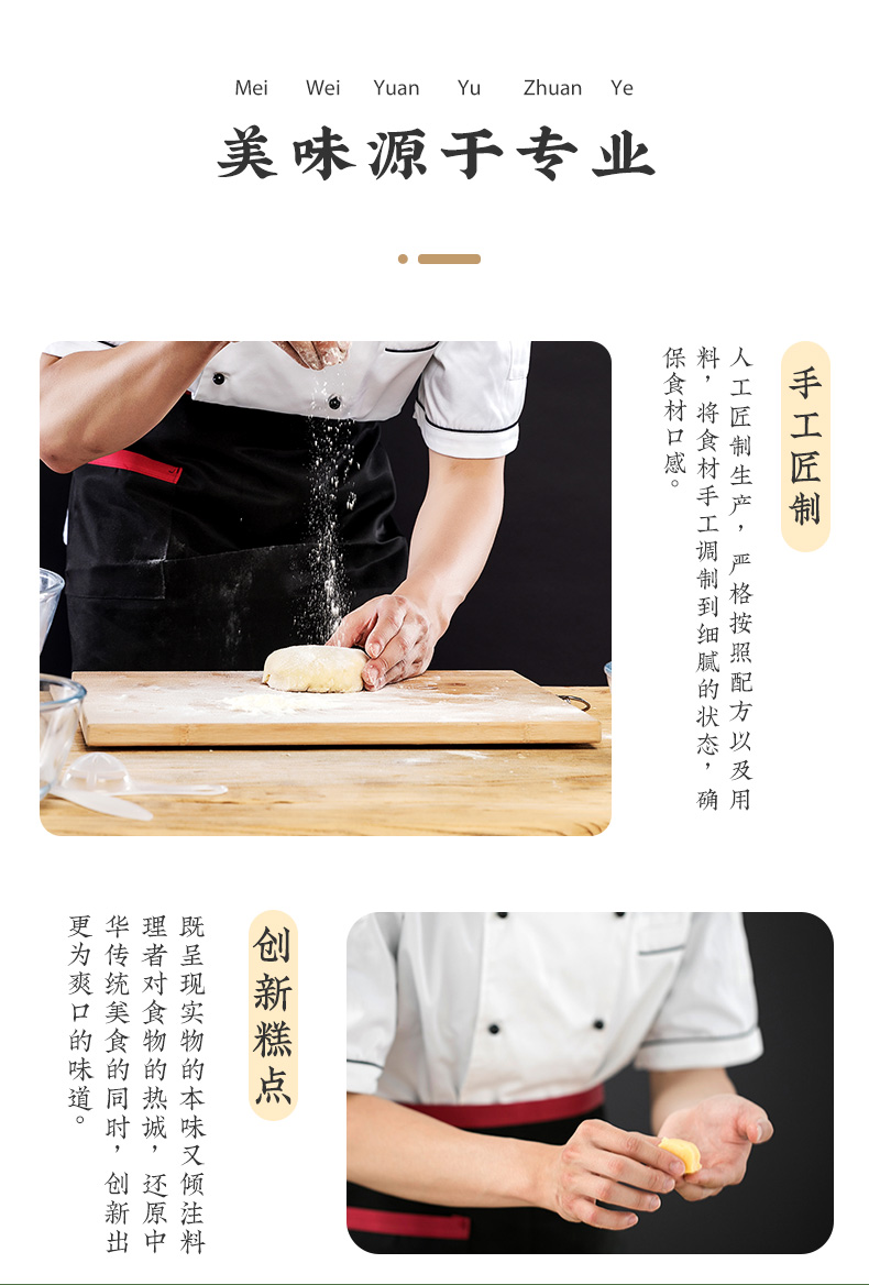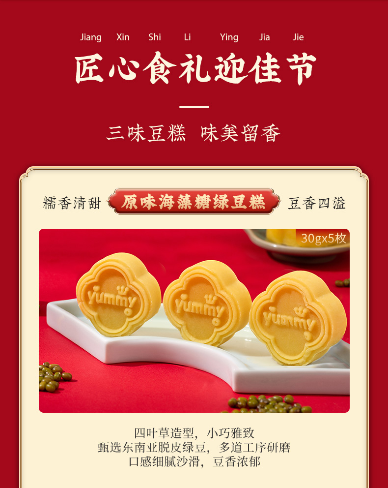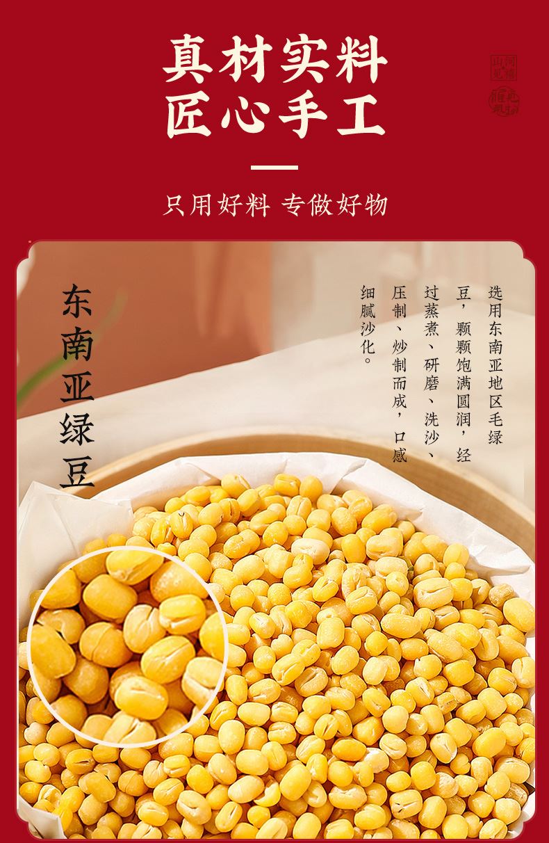 1、選用東南亞地區毛綠豆,顆顆飽滿圓潤,經過選色、比重、篩選、研磨、去皮,人工挑選、蒸煮、過濾、碾壓、配比、炒制等多道工藝制成,口感細膩沙滑,豆香濃郁