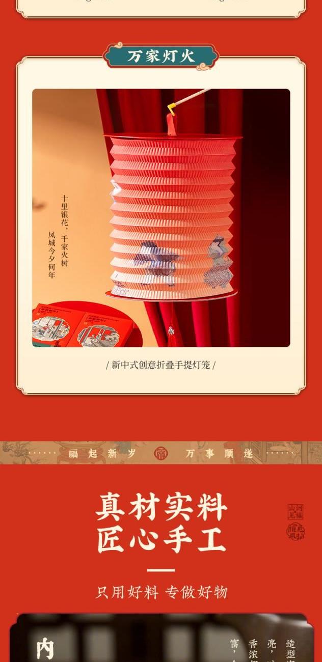 4.禮盒內(nèi)部巧妙隱藏著一個可親手組裝的精美燈籠,組裝后如同燈火映萬家,傳遞著團(tuán)圓與美滿,送禮自用兩相宜。