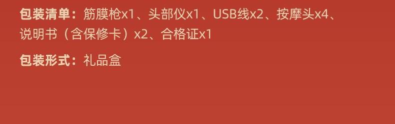 型號: PG-M191+PG-2705(禮盒套裝) 顏色:深藍色+天空灰 材質:ABS+電子元器件等 包裝盒尺寸: 314x275x80mm 重量:約1300g 包裝清單:筋膜槍x1、頭部儀x1、USB線x2、按摩頭x4、說明書(含保修卡)x2、合格證x 1 包裝形式:禮品盒