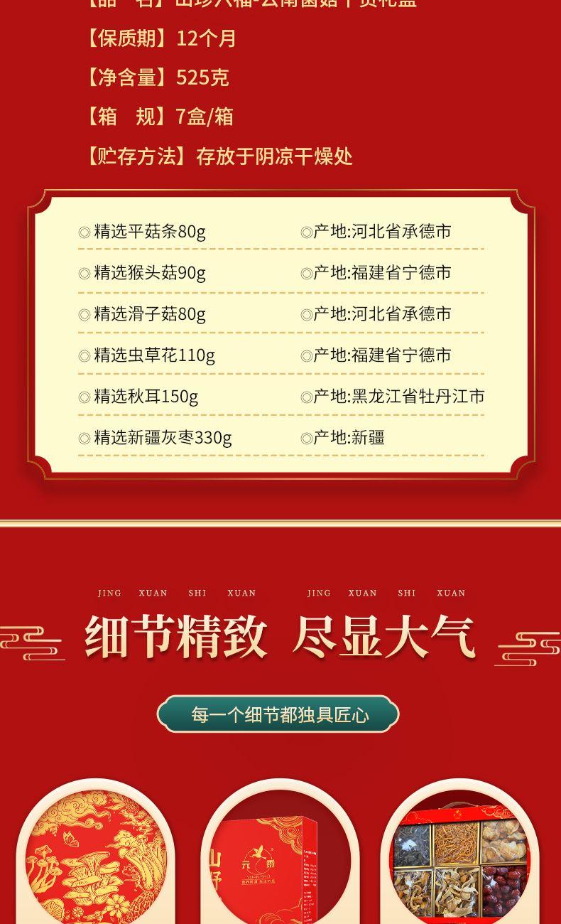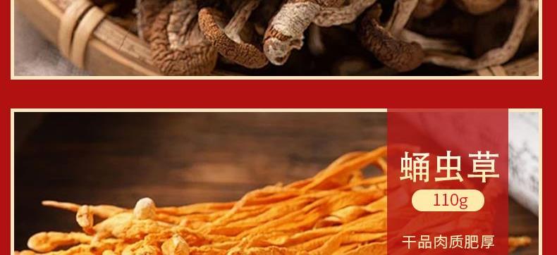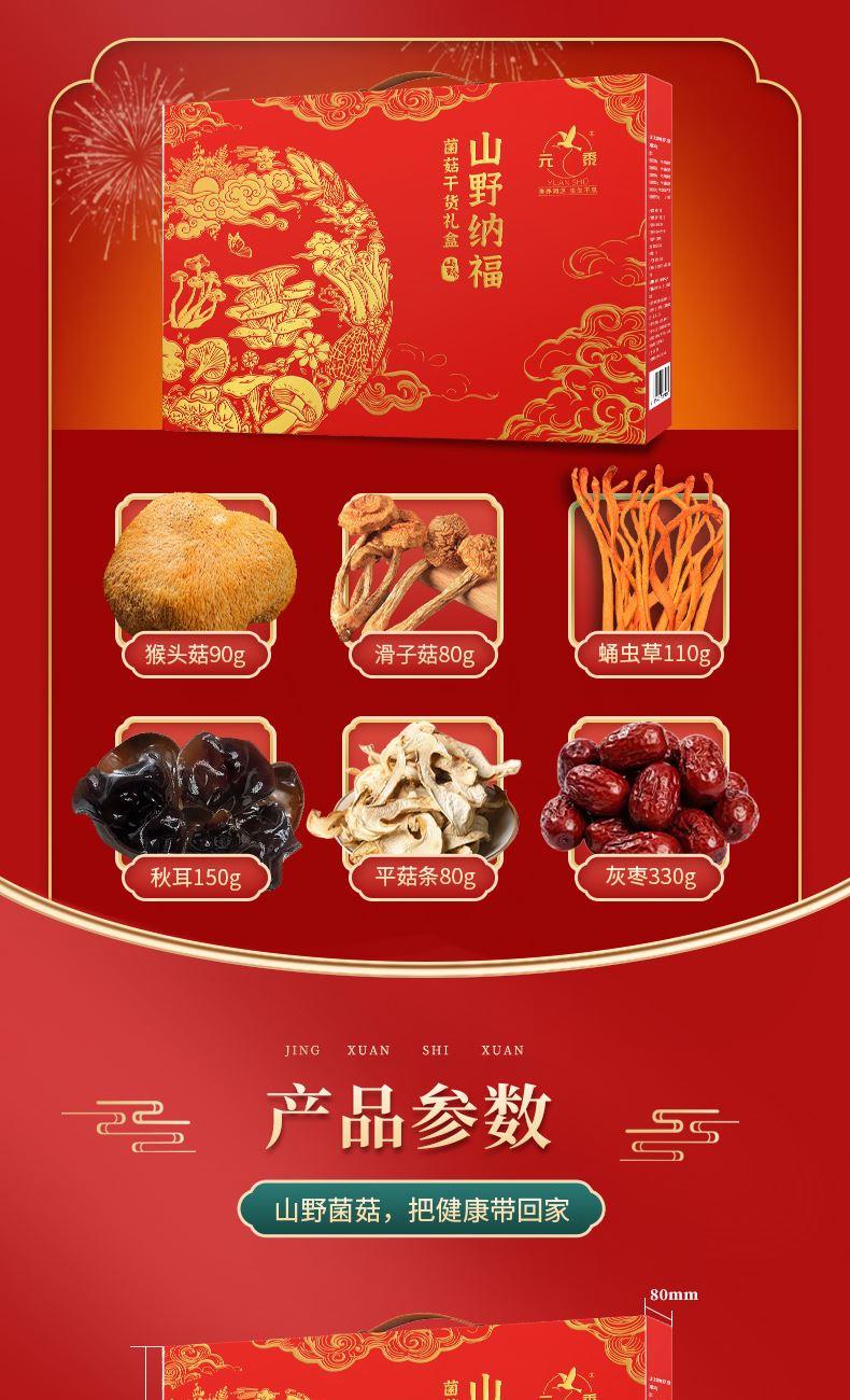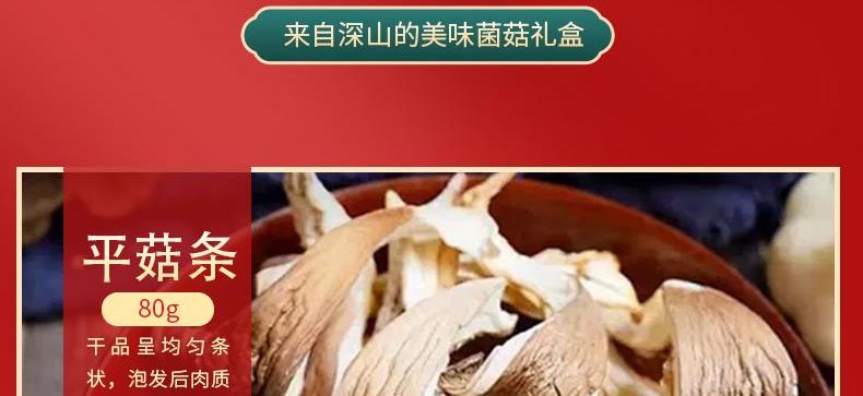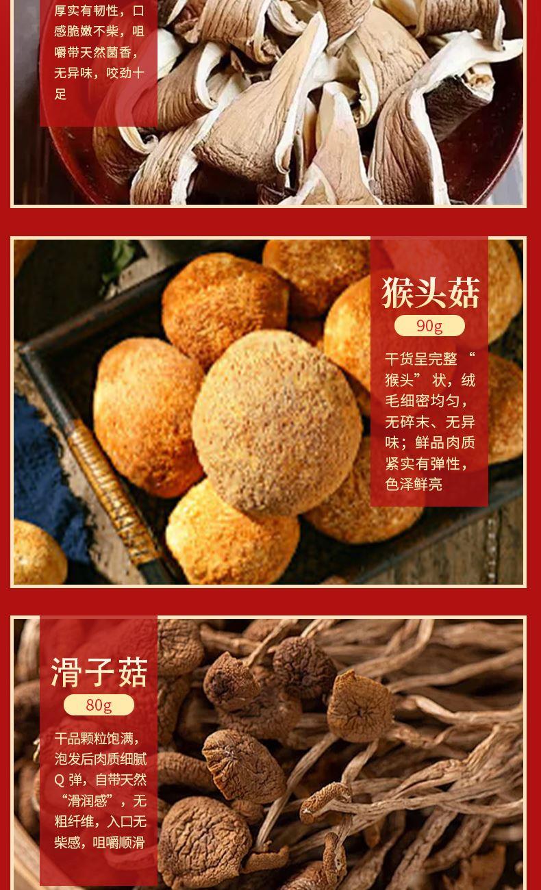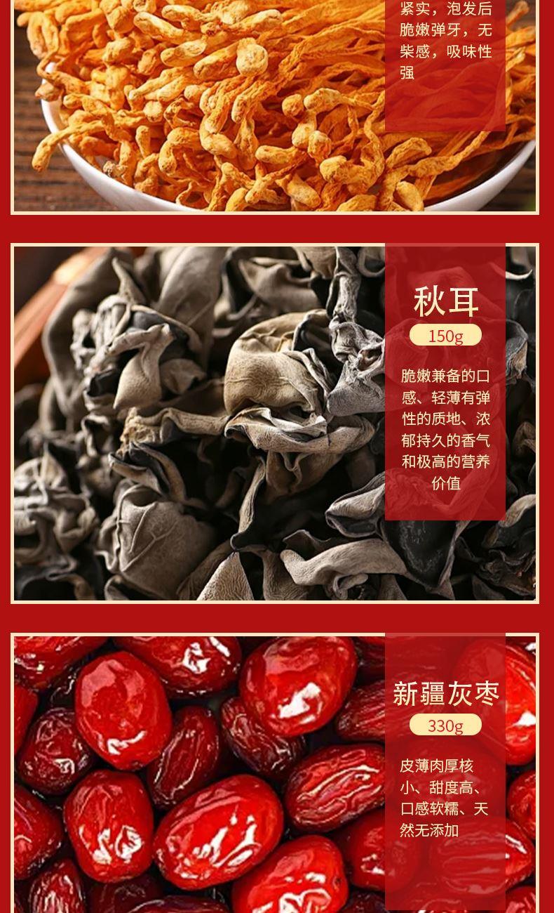 精選平菇條80g 產地:河北省承德市 精選猴頭菇90g 產地:福建省寧德市 精選滑子菇80g 產地:河北省承德市 精選蟲草花110g 產地:福建省寧德市 精選秋耳150g 產地:黑龍江省牡丹江市 精選新疆灰棗330g 產地:新疆