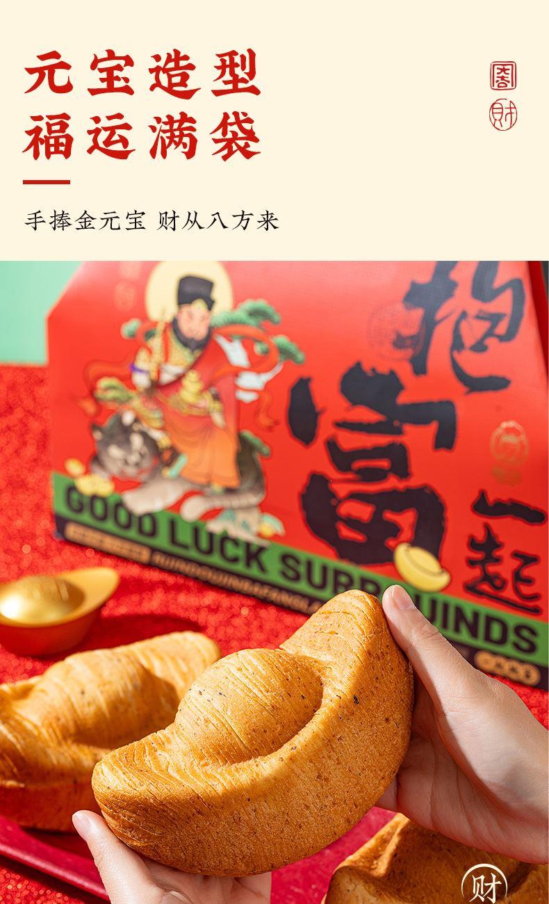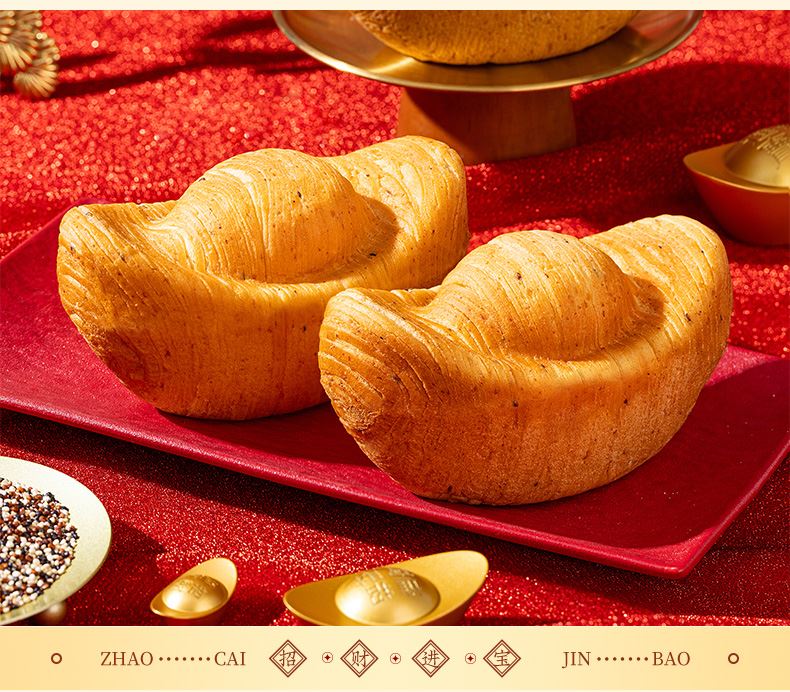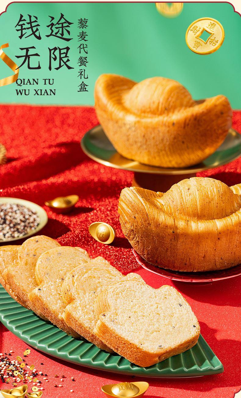 1、以經典??元寶造型??傳遞“招財進寶”的美好祝福,契合佳節禮品場景;更創新性地加入??東鄉藜麥??,提升了面包的營養價值,打破了傳統白面包的單一形式