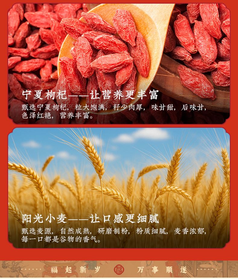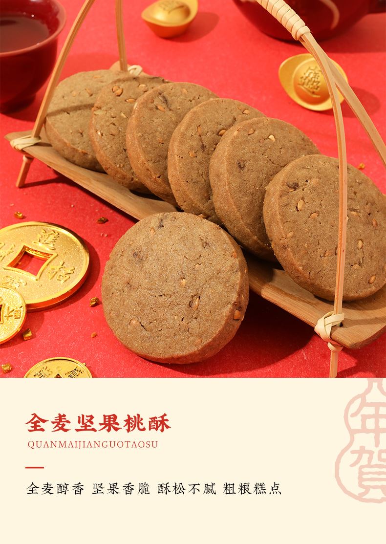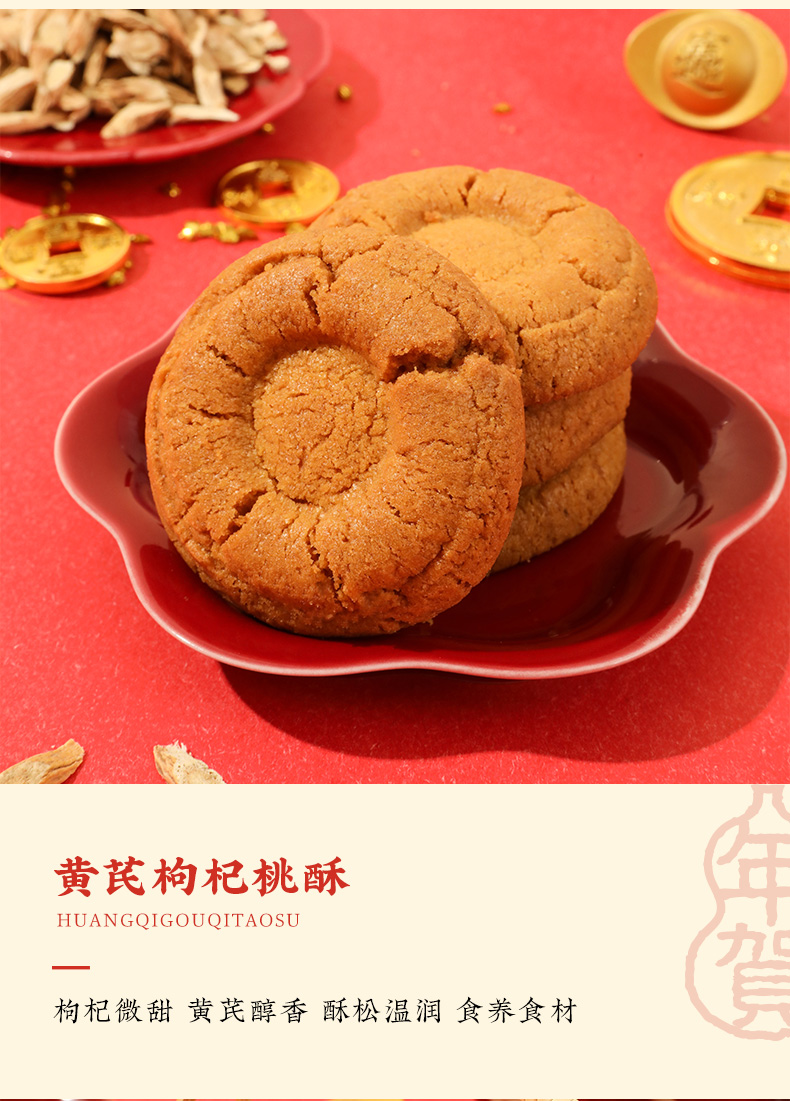 2、將傳統中式食補理念融入點心,創新性地添加了內蒙黃芪、寧夏枸杞兩種養生食材,枸杞的天然甘甜與黃芪的獨特草本香氣,能為傳統桃酥增添復雜而溫和的韻味,口感別具一格。