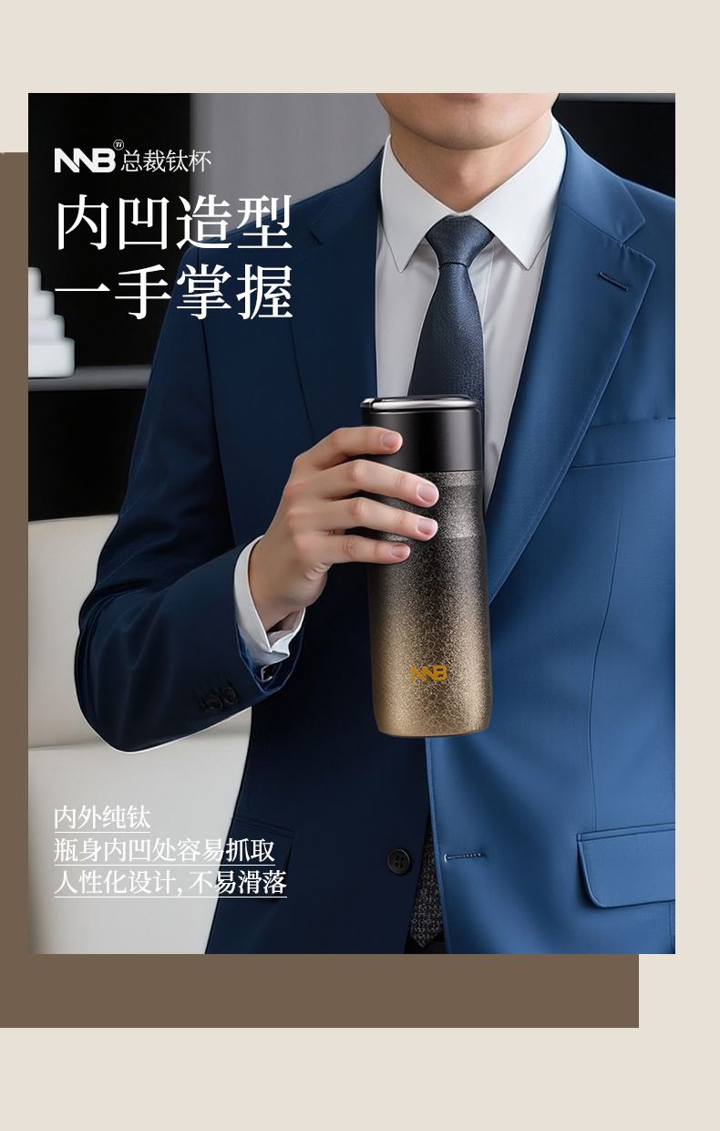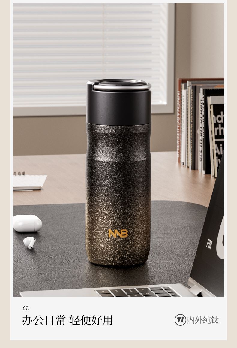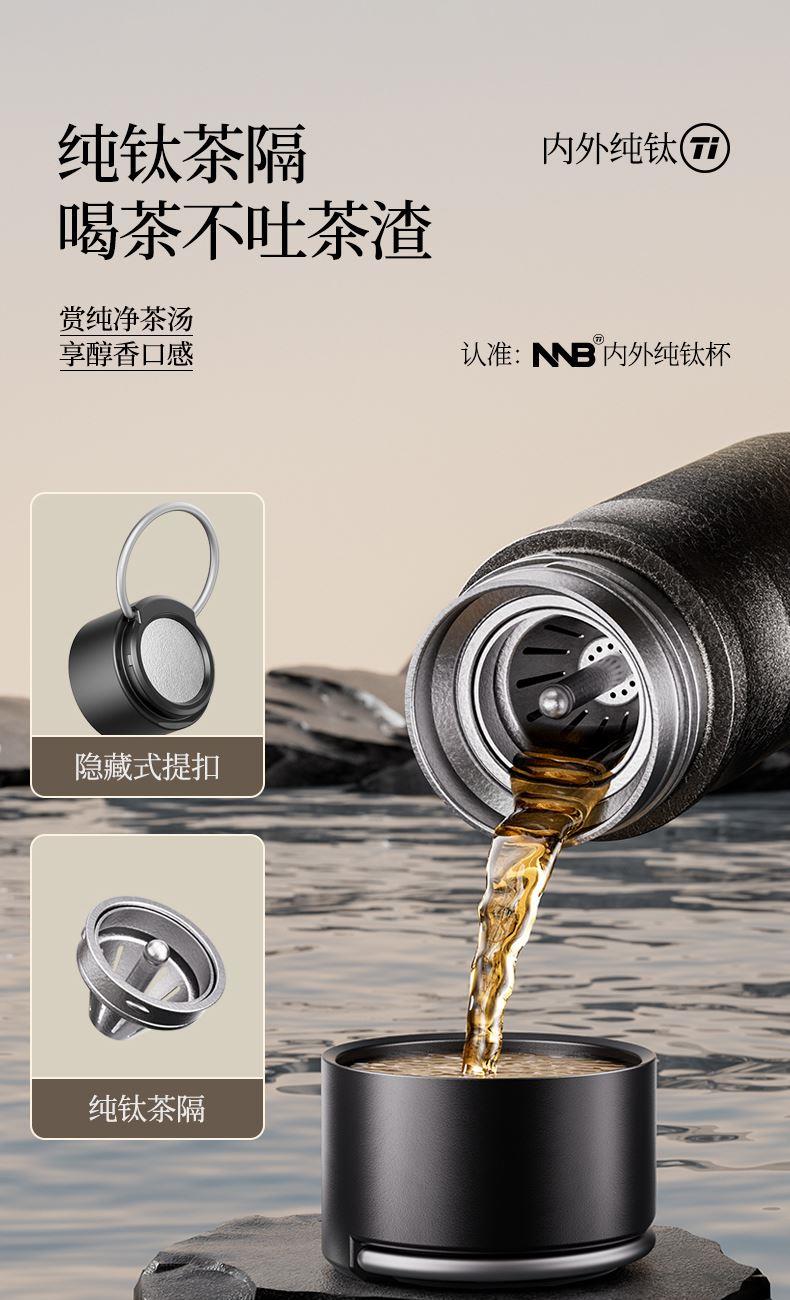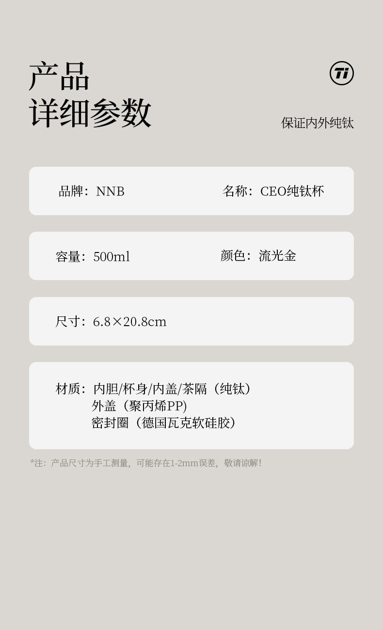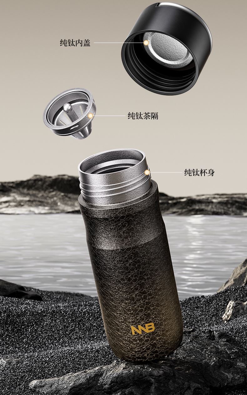 產品規格: 品 牌:NNB/牛牛杯 容 量:500ml 尺 寸:6.4*7.1*19.8cm 內 膽:純鈦(TA1) 外 殼:純鈦(TA1) 杯 蓋:PP聚丙烯 密封圖:硅橡膠 包 裝:彩盒/禮盒 產品特點: ? 99.5%高純度鈦材,耐酸堿抗腐蝕 ? 雙層真空鎖溫技術,6-8h保溫鎖冷 ? 鈦磁懸鏡面拋光技術 ? 執行標準:QB/T 5612-2021《鈦杯》