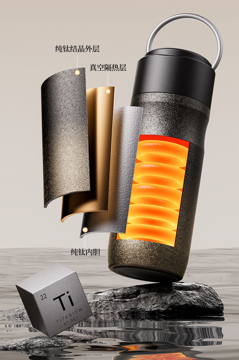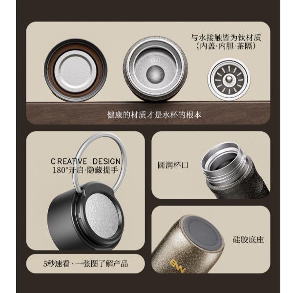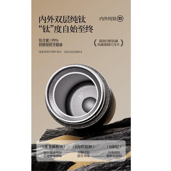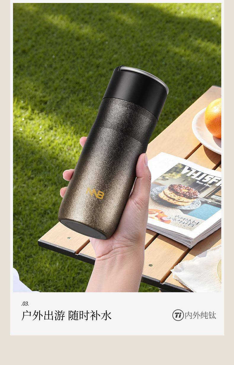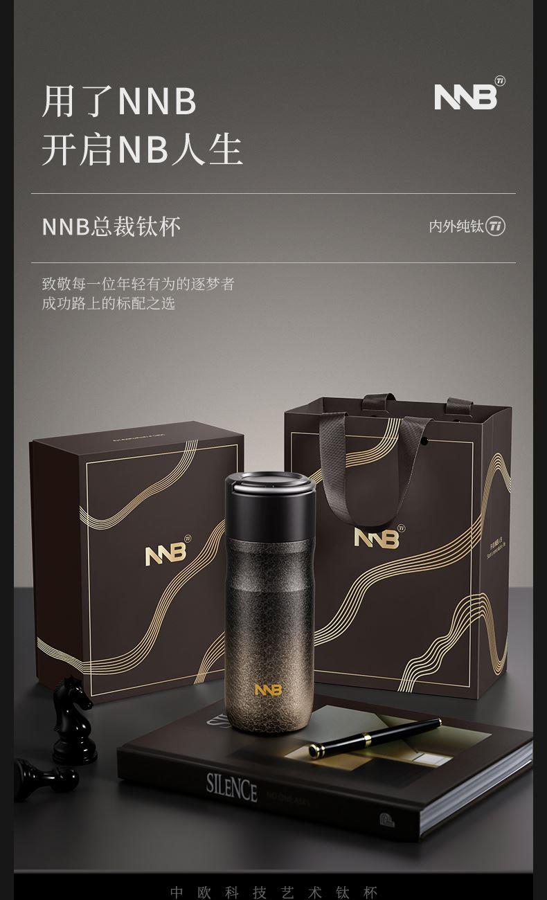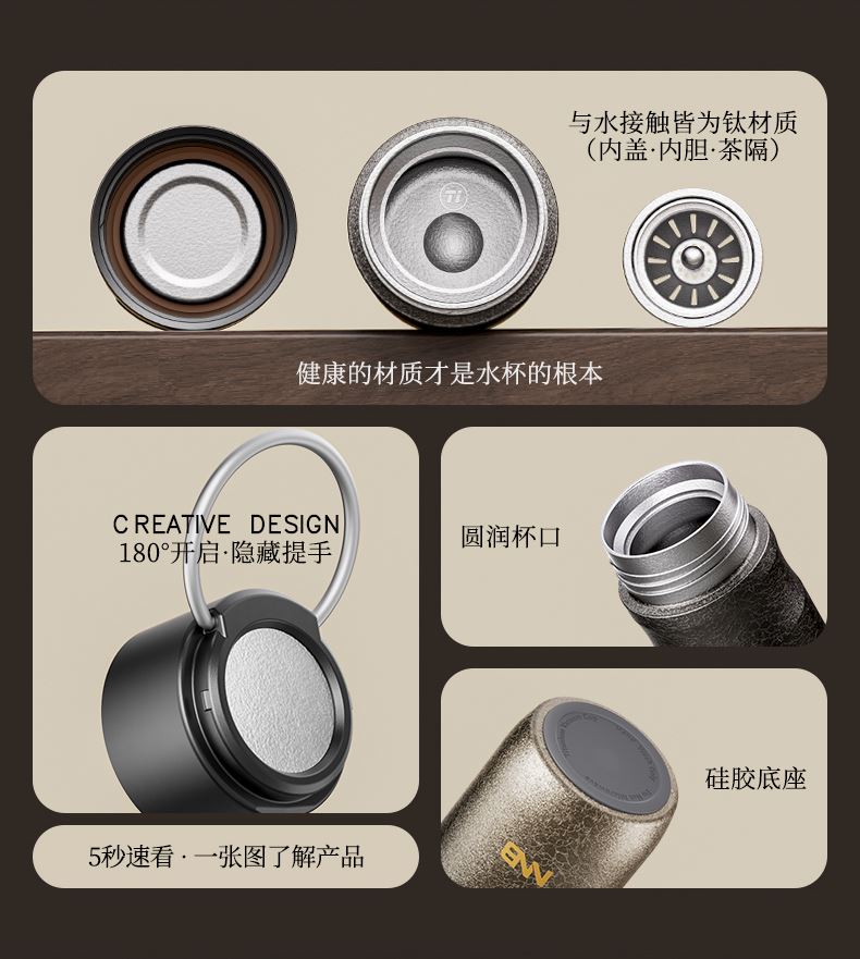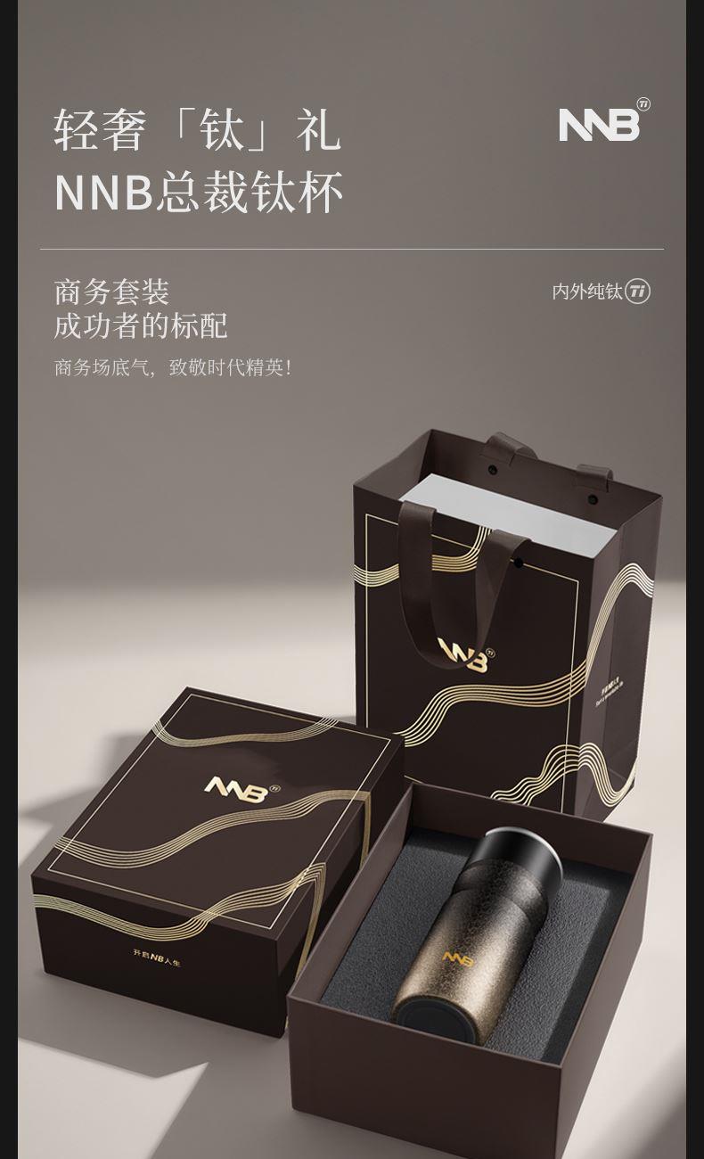 產品規格: 品 牌:NNB/牛牛杯 容 量:500ml 尺 寸:6.4*7.1*19.8cm 內 膽:純鈦(TA1) 外 殼:純鈦(TA1) 杯 蓋:PP聚丙烯 密封圖:硅橡膠 包 裝:彩盒/禮盒 產品特點: ? 99.5%高純度鈦材,耐酸堿抗腐蝕 ? 雙層真空鎖溫技術,6-8h保溫鎖冷 ? 鈦磁懸鏡面拋光技術 ? 執行標準:QB/T 5612-2021《鈦杯》