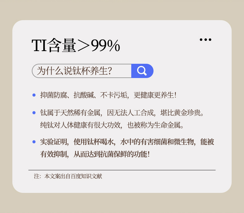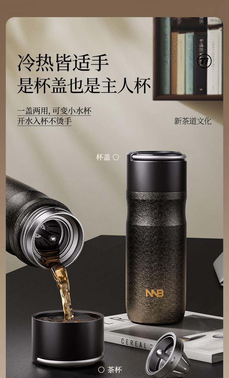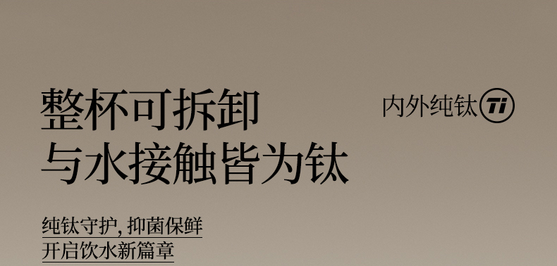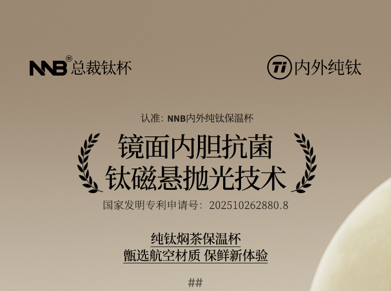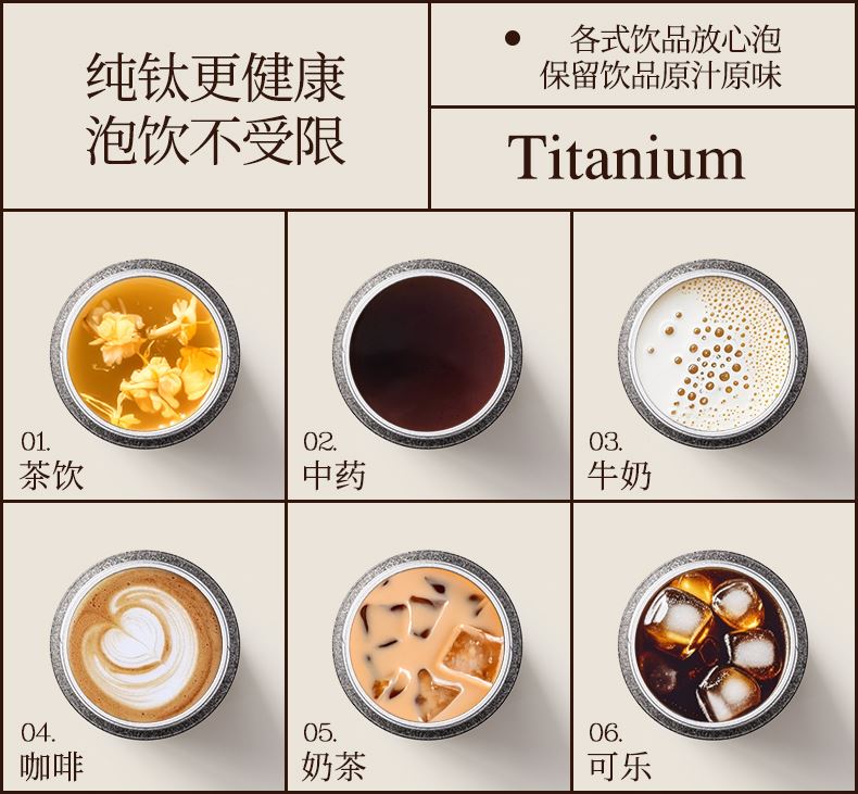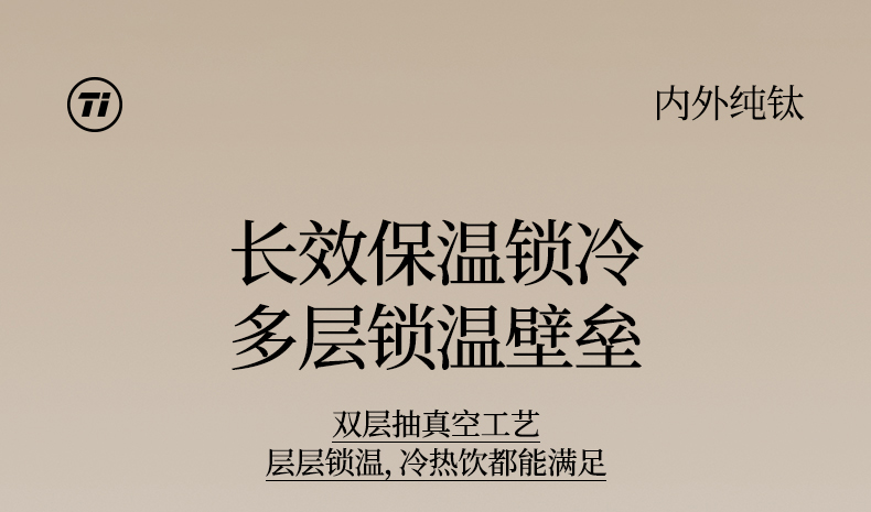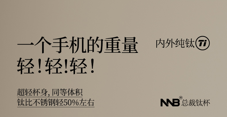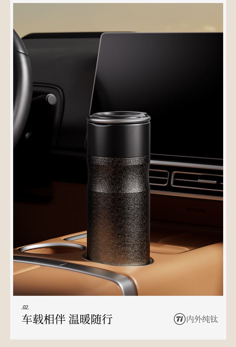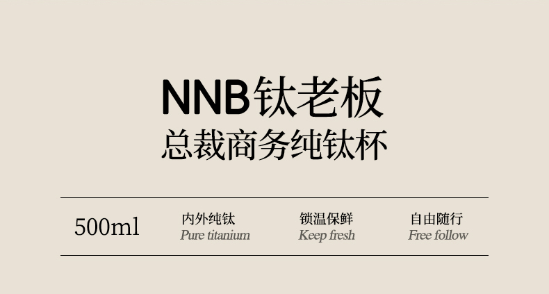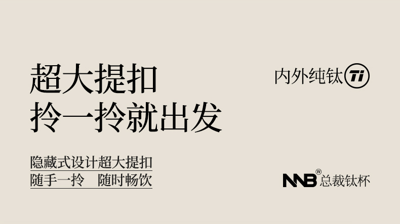產品規格: 品 牌:NNB/牛牛杯 容 量:500ml 尺 寸:6.4*7.1*19.8cm 內 膽:純鈦(TA1) 外 殼:純鈦(TA1) 杯 蓋:PP聚丙烯 密封圖:硅橡膠 包 裝:彩盒/禮盒 產品特點: ? 99.5%高純度鈦材,耐酸堿抗腐蝕 ? 雙層真空鎖溫技術,6-8h保溫鎖冷 ? 鈦磁懸鏡面拋光技術 ? 執行標準:QB/T 5612-2021《鈦杯》